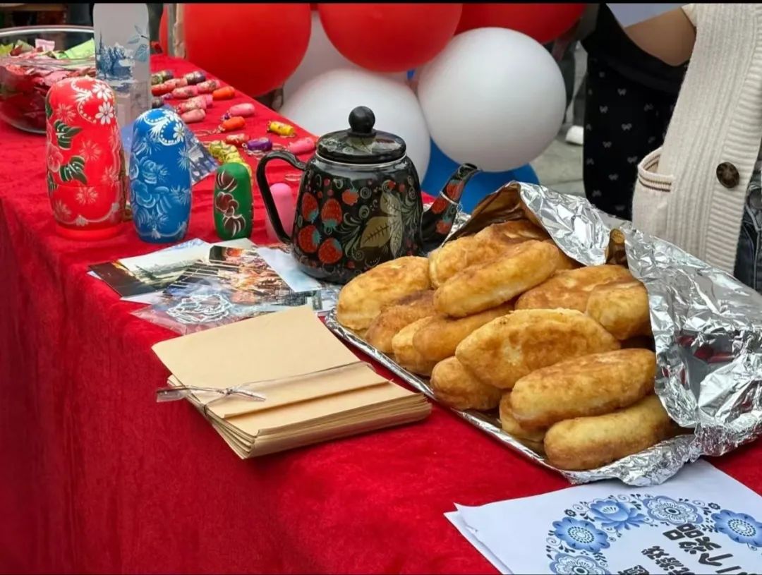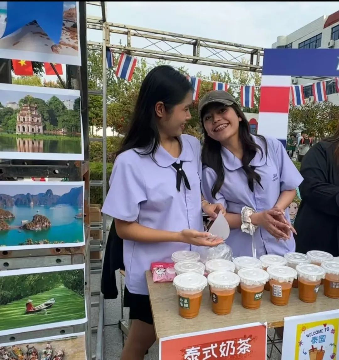 在文化集市上,多个国家和地区的特色文化展品琳琅满目。不仅有代表中国传统文化的漆扇、拓印、香囊。来自俄罗斯的烤包子、套娃,来自日本的抹茶,韩国同学现场制作的烤肉,来自越南的米粉、咖啡和三明治,泰式奶茶,还有巴基斯坦同学带来的特色炒饭以及各个国家的特色服饰和纪念品!各式中外美食不仅满足了人们的味蕾,更巧妙地融入了文化交流的精神。