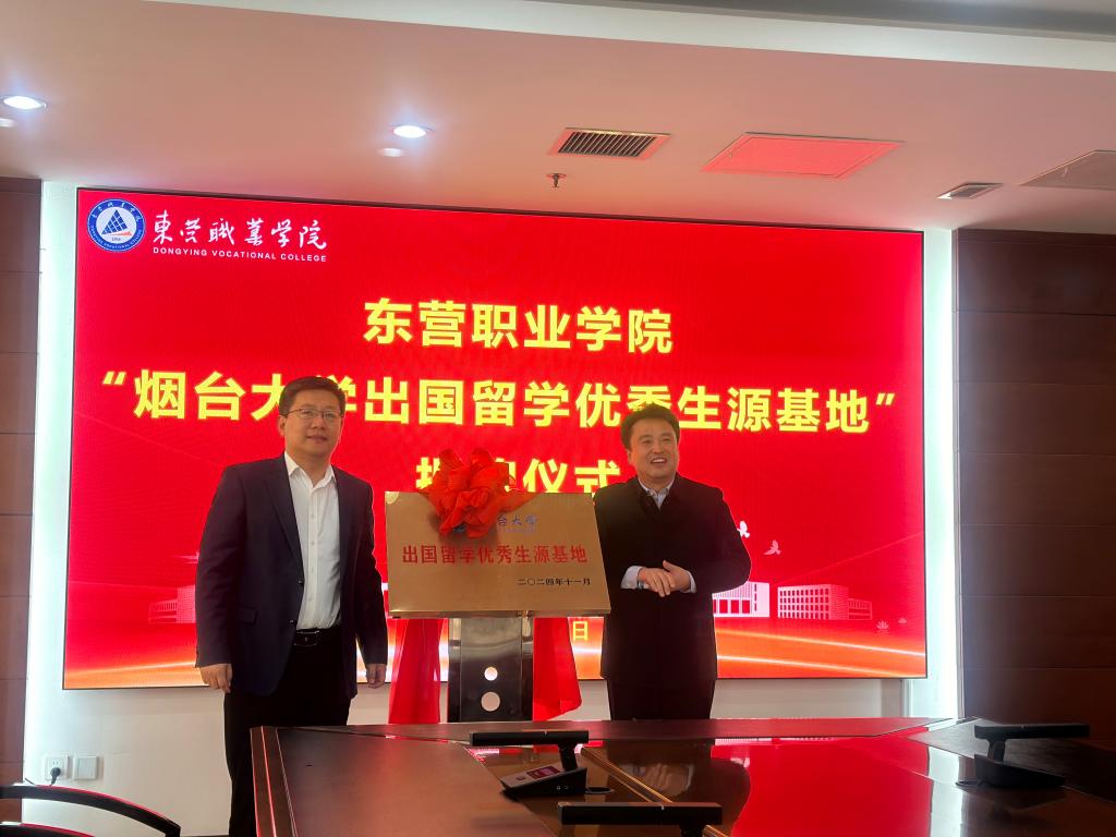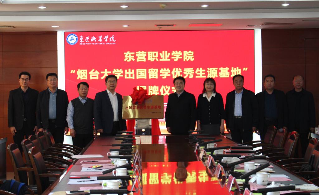 出国留学优秀生源基地”揭牌仪式。东营职业学院党委副书记、院长解涛和相关部门负责人参加了揭牌仪式。