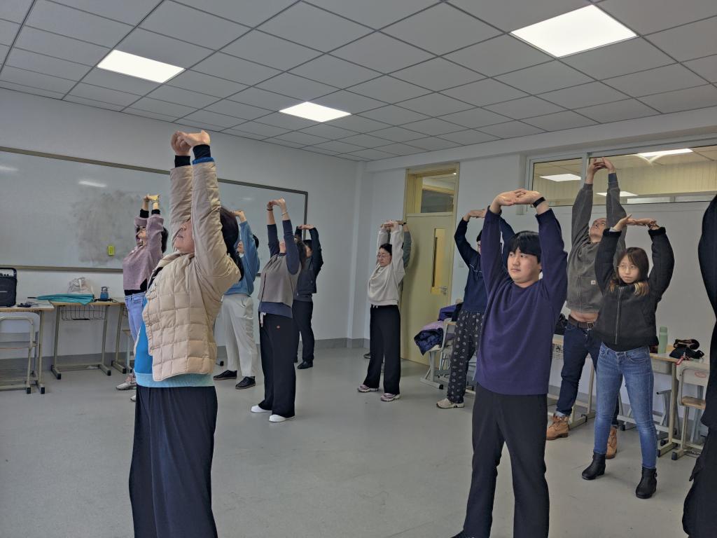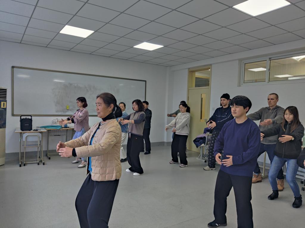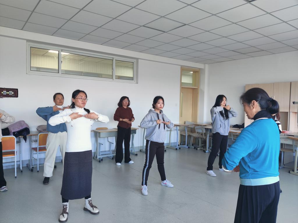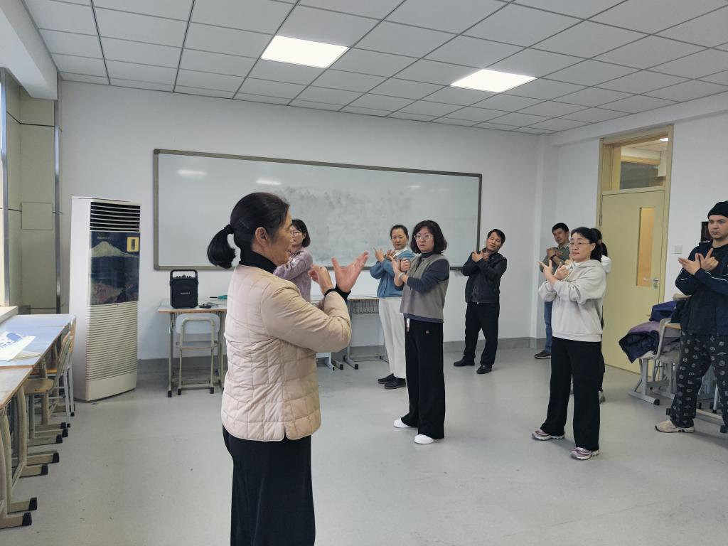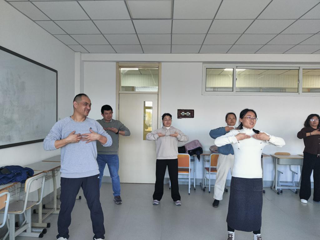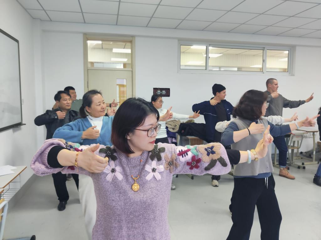 的教室里,留学生跟学院教职工一起跟随老师学习八段锦。他们开步屈膝,仰头翻掌,两手攀足,呼气吐气,每个动作都做得认真而专注。第一次八段锦教学顺利落下帷幕,留学生们意犹未尽,纷纷表示出他们对八段锦继续学习的期待。