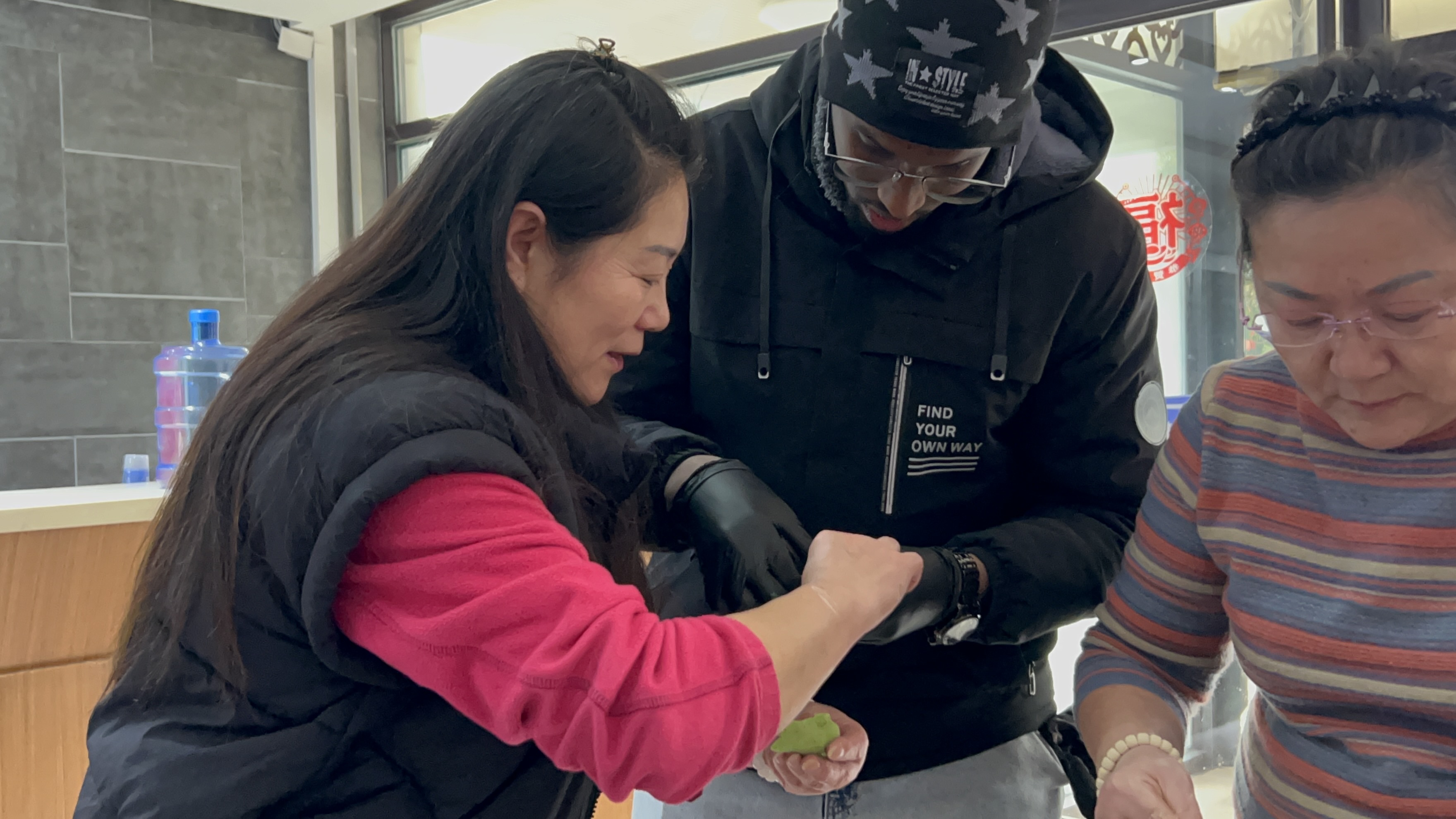 活动当天清晨,宿管阿姨们早早开始准备。她们依照清单整理好白菜猪肉、韭菜鸡蛋、芹菜牛肉三种馅料,并用菠菜汁、火龙果汁揉制成绿色与红色面团。白色、绿色、红色面团分别搭配不同馅料,色彩明快,整齐摆上桌后,立刻吸引了同学们的目光与称赞。